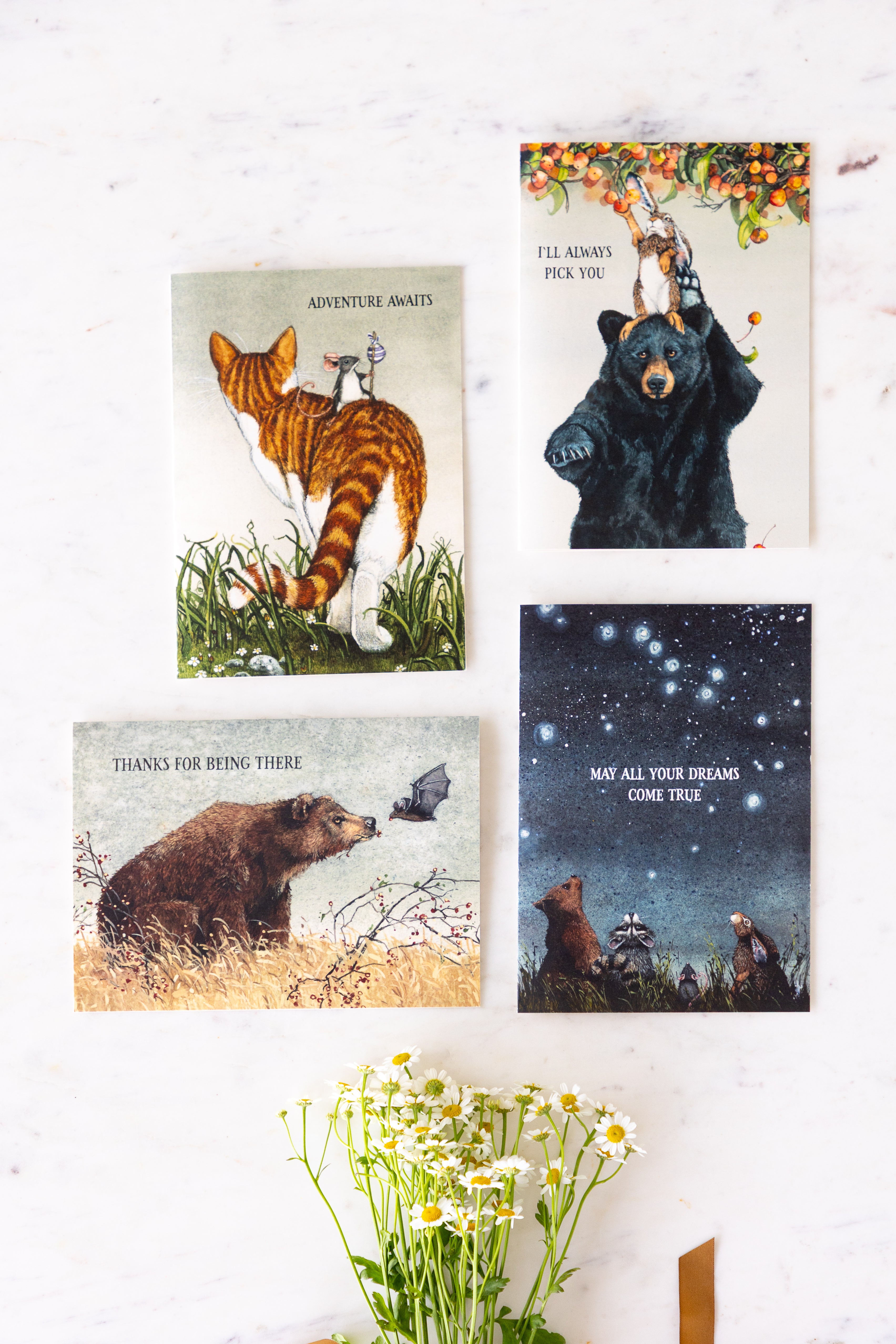 Maggie Vandewalle’s watercolor greeting cards are sure to delight any recipient. Maggie depicts animals and their environments realistically but with quirks, a bit of humor and always with great respect. She recalls a childhood divided between two passions-an insatiable love of reading and a profound fascination for the natural world. These early interests are the foundation for her paintings of whimsical creatures whose antics often bring a smile or a feeling that one has walked into the middle of a remarkable journey.