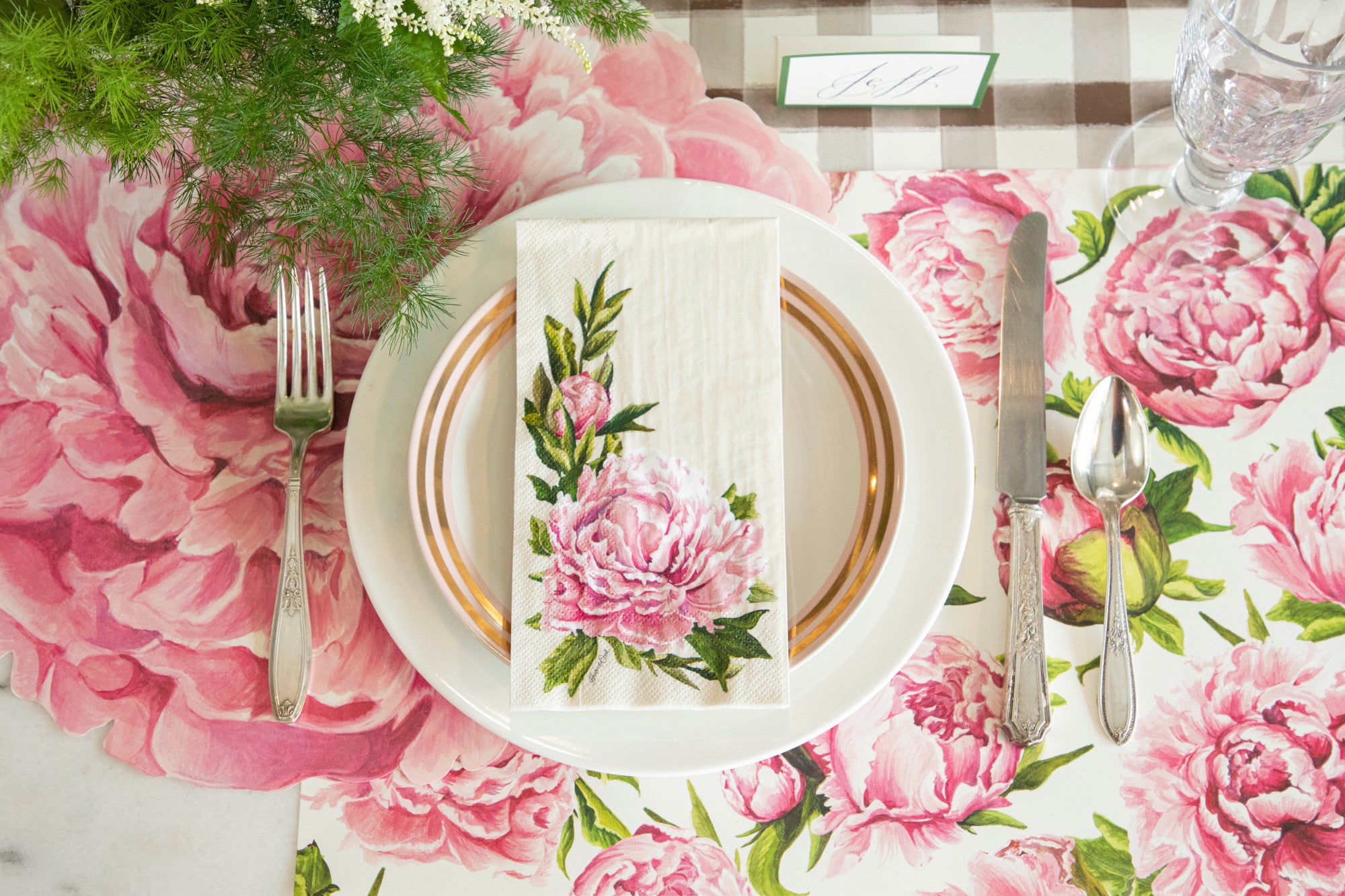 If you’re like us, you are filled with anticipation for the arrival of peonies each spring. From tightly balled buds to fully unfurled blossoms, we can hardly get enough of these flowers. Whether styling for a bridal brunch or a garden party, layer in pieces to your heart ’s content. Like the generous ruffles of petals on the flowers, more is more in this collection of painted pink peonies!