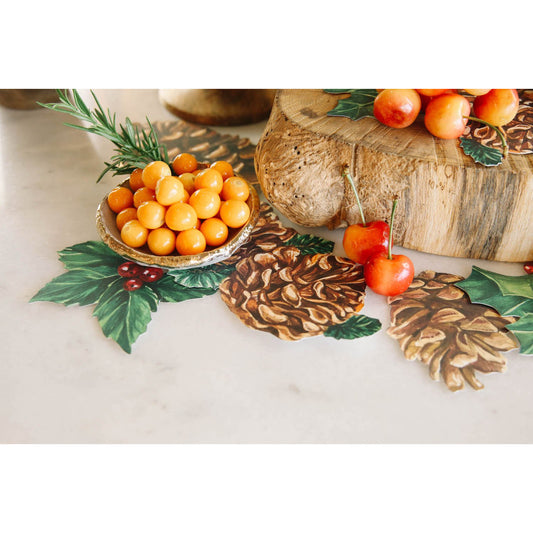 A Christmas table setting featuring the Holiday Wreath Serving Papers with various fruit, nuts cheeses and bread.