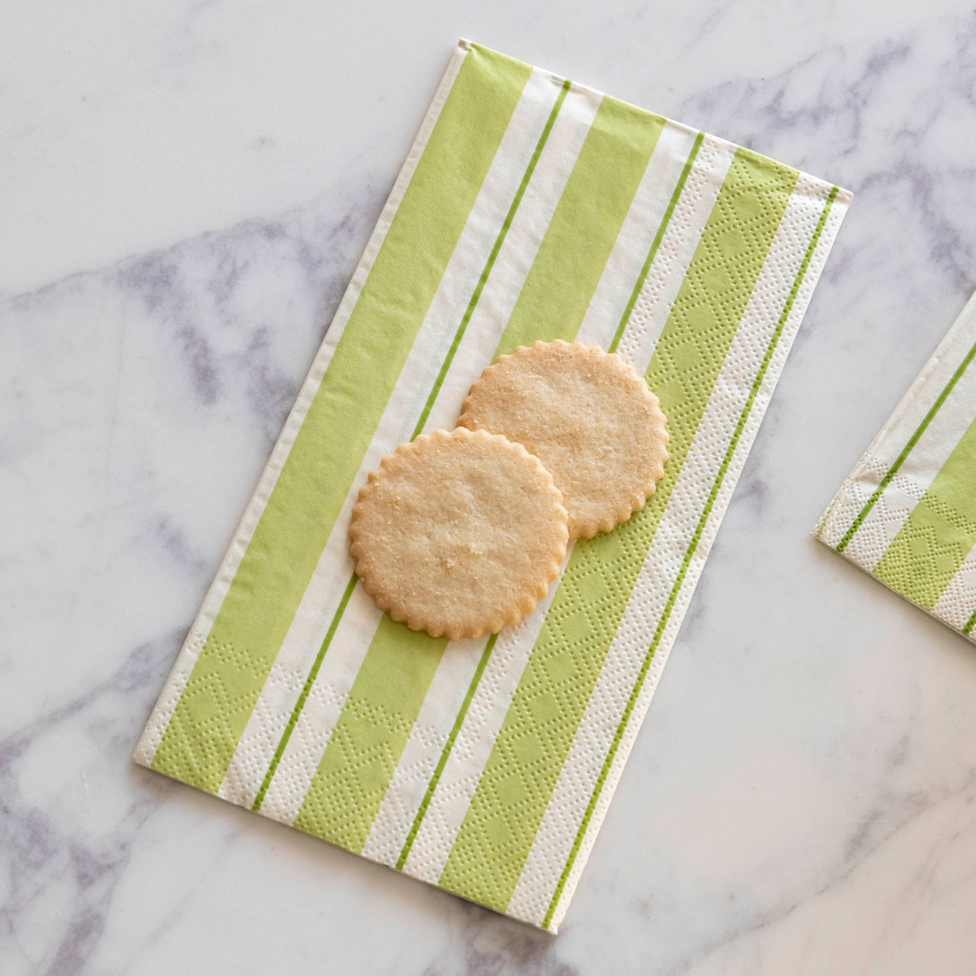 Two Green Awning Strip Napkins on a white table: a Guest napkin with two sugar cookies on it, and a Cocktail napkin under a glass.