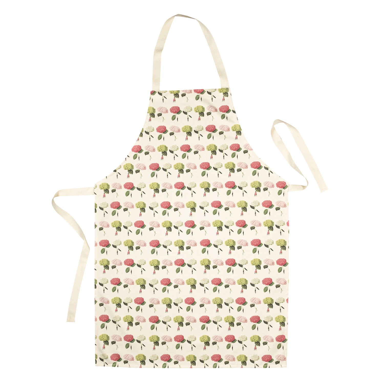 A linen apron patterned with illustrated tiny people holding gigantic hydrangea blooms by the stems, in pink, white and green.