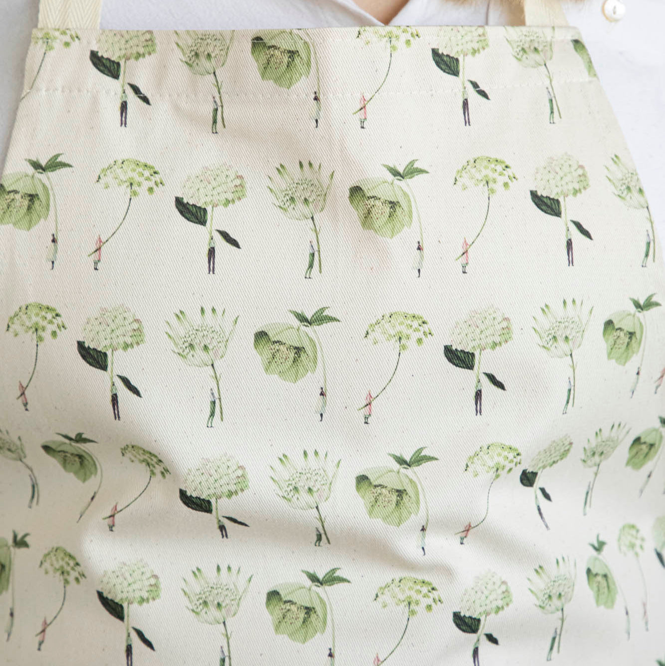 A linen apron patterned with illustrated tiny people holding gigantic pale green blooms by the stems.