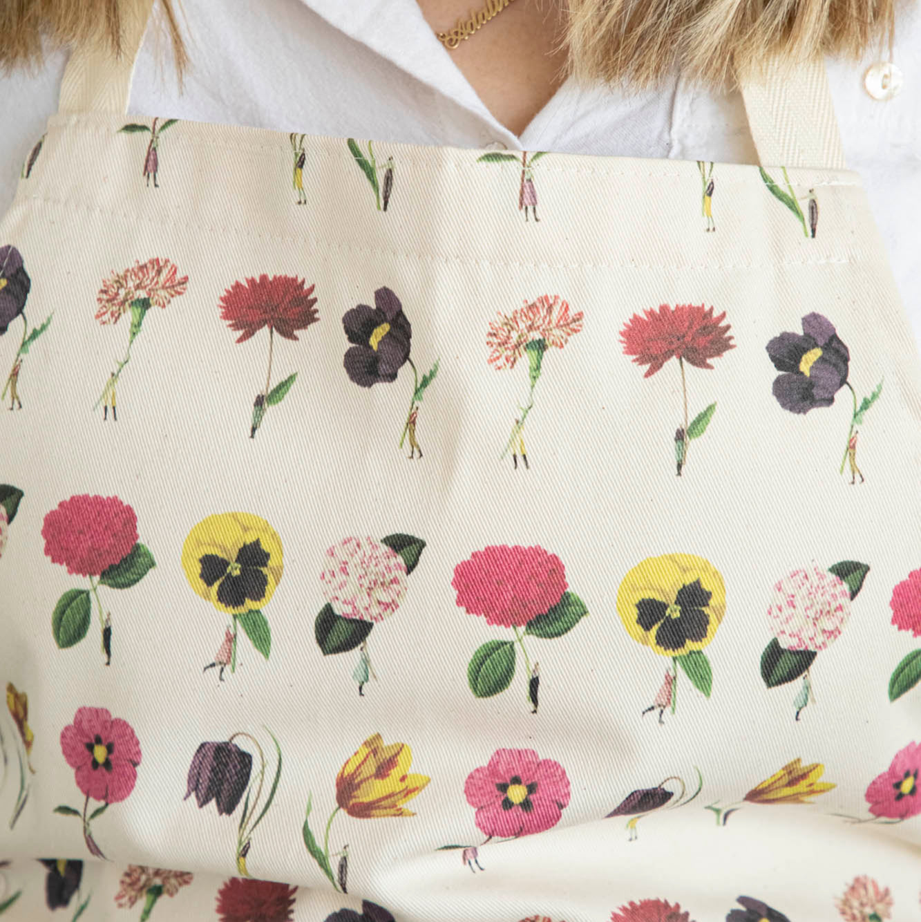 A linen apron patterned with illustrated tiny people holding gigantic vibrant blooms by the stems, in pink, yellow, red and purple.