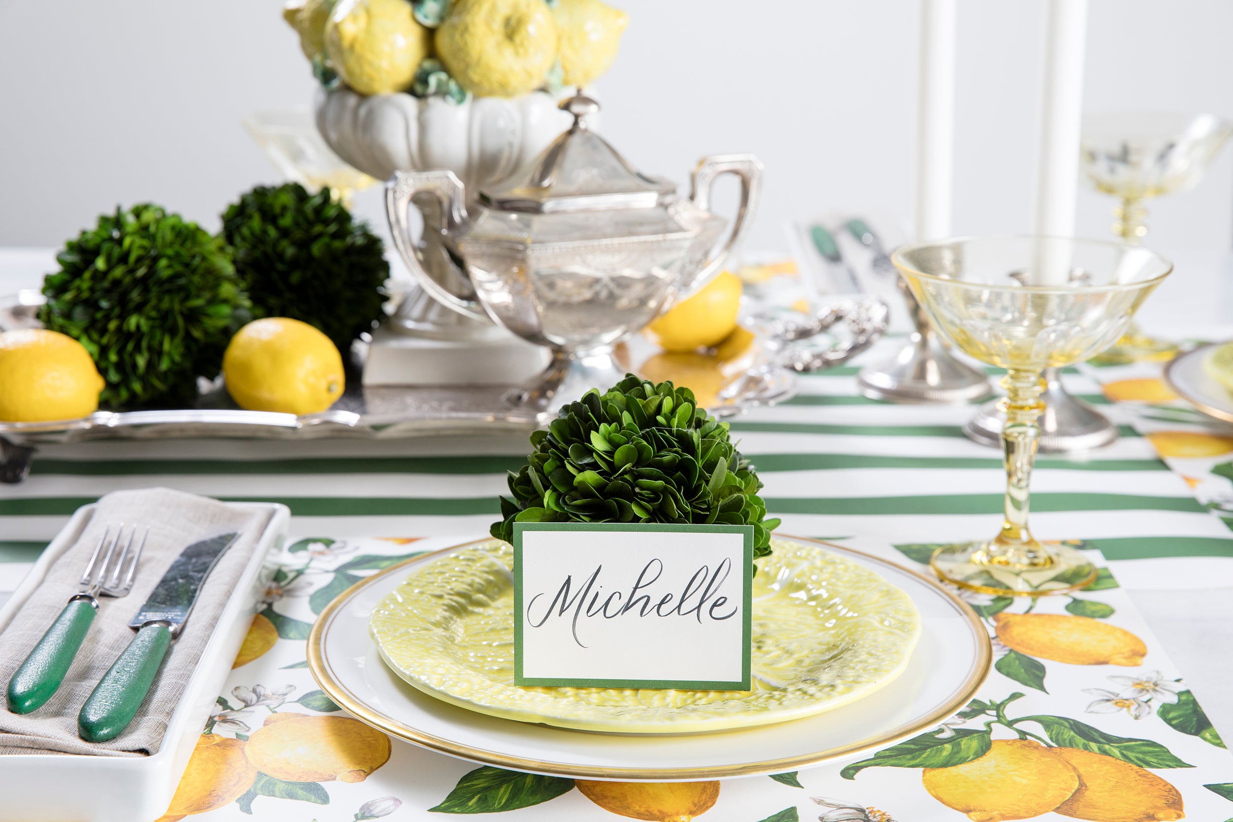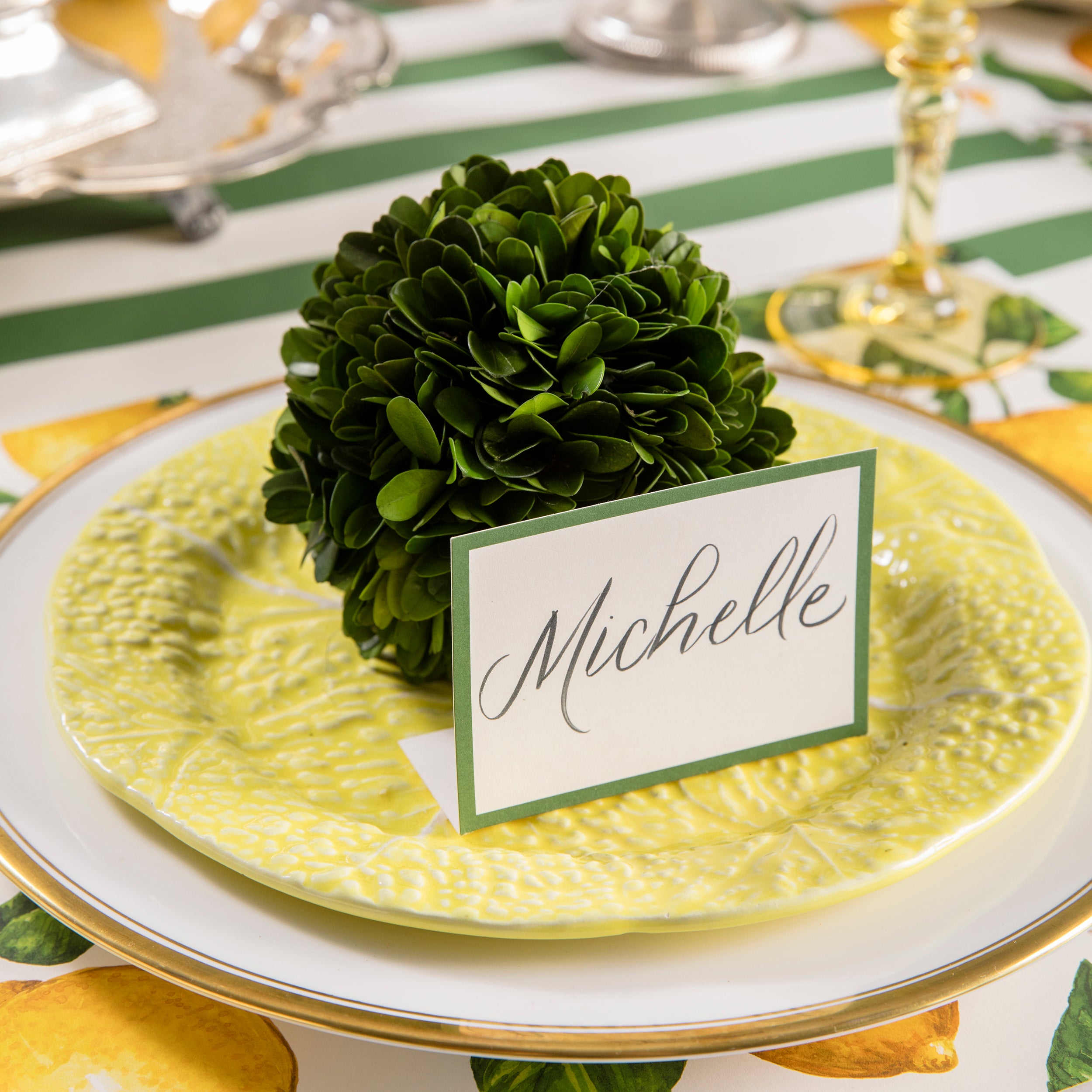 A Preserved Boxwood Sphere with a place card and lemons on it, painstakingly assembled by masterful artists, made by Accent Decor.