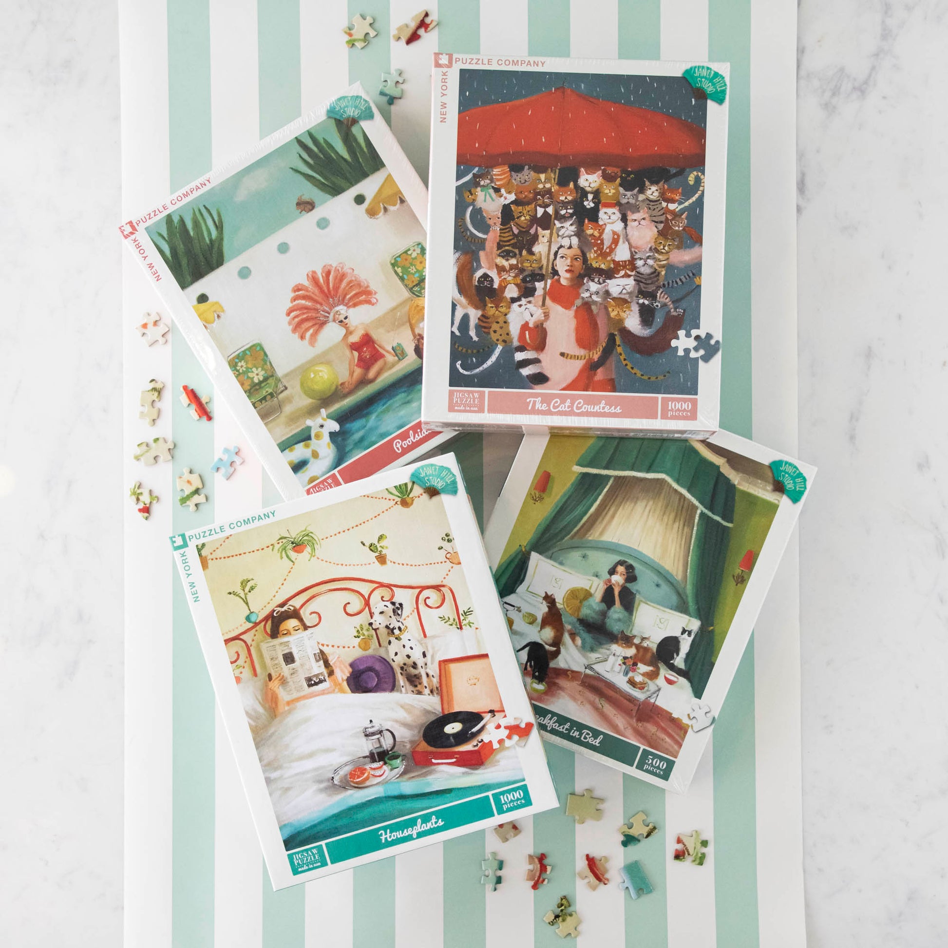 A woman holding a red umbrella surrounded by numerous illustrated cats in various poses and expressions is portrayed in a whimsical painting by Janet Hill on the Cat Countess Puzzle by New York Puzzle Company.