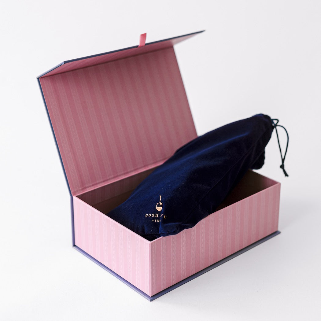 close up of gold good juju printed on the blue velvet bag the puzzle comes in
