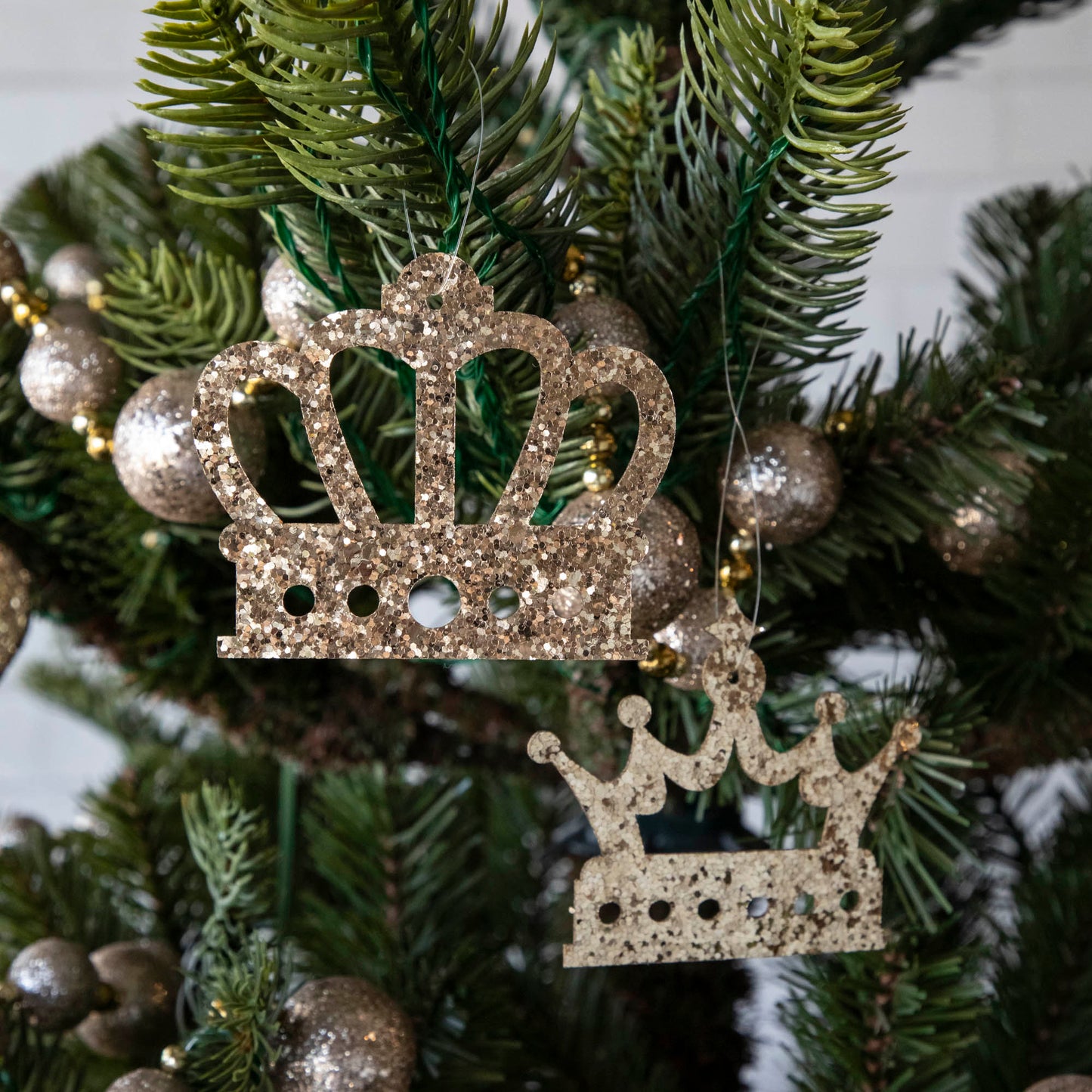 Gold glitter crown-shaped ornaments hanging on a Christmas tree.
