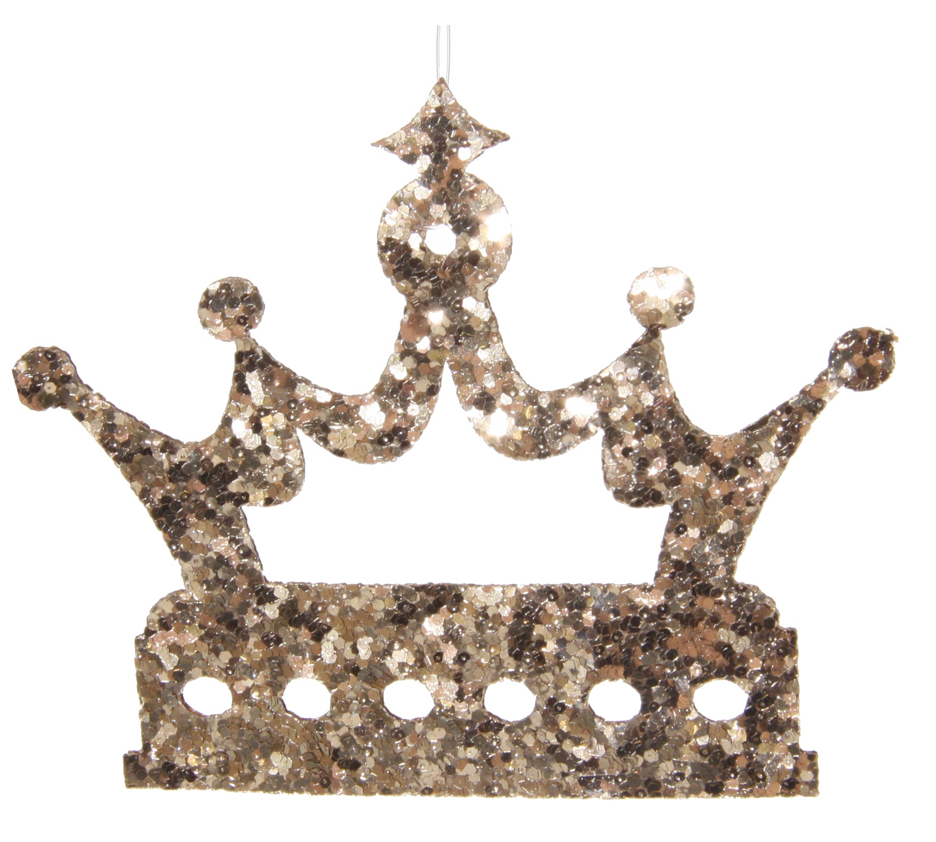 Gold glitter crown-shaped ornament hanging on a Christmas tree.