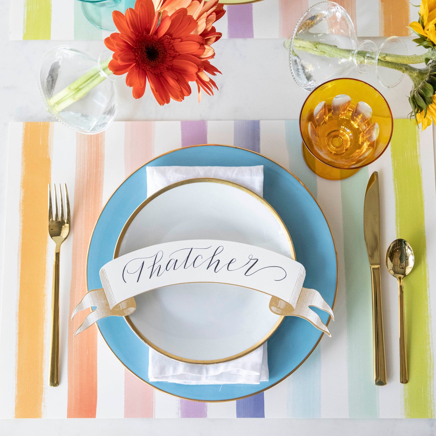 Colorful table setting with the Sorbet Painted Stripe Placemat, colorful plates and cutlery atop, and Classic Gold Banner Table Accent on the Marigold Classic Stripe Runner.