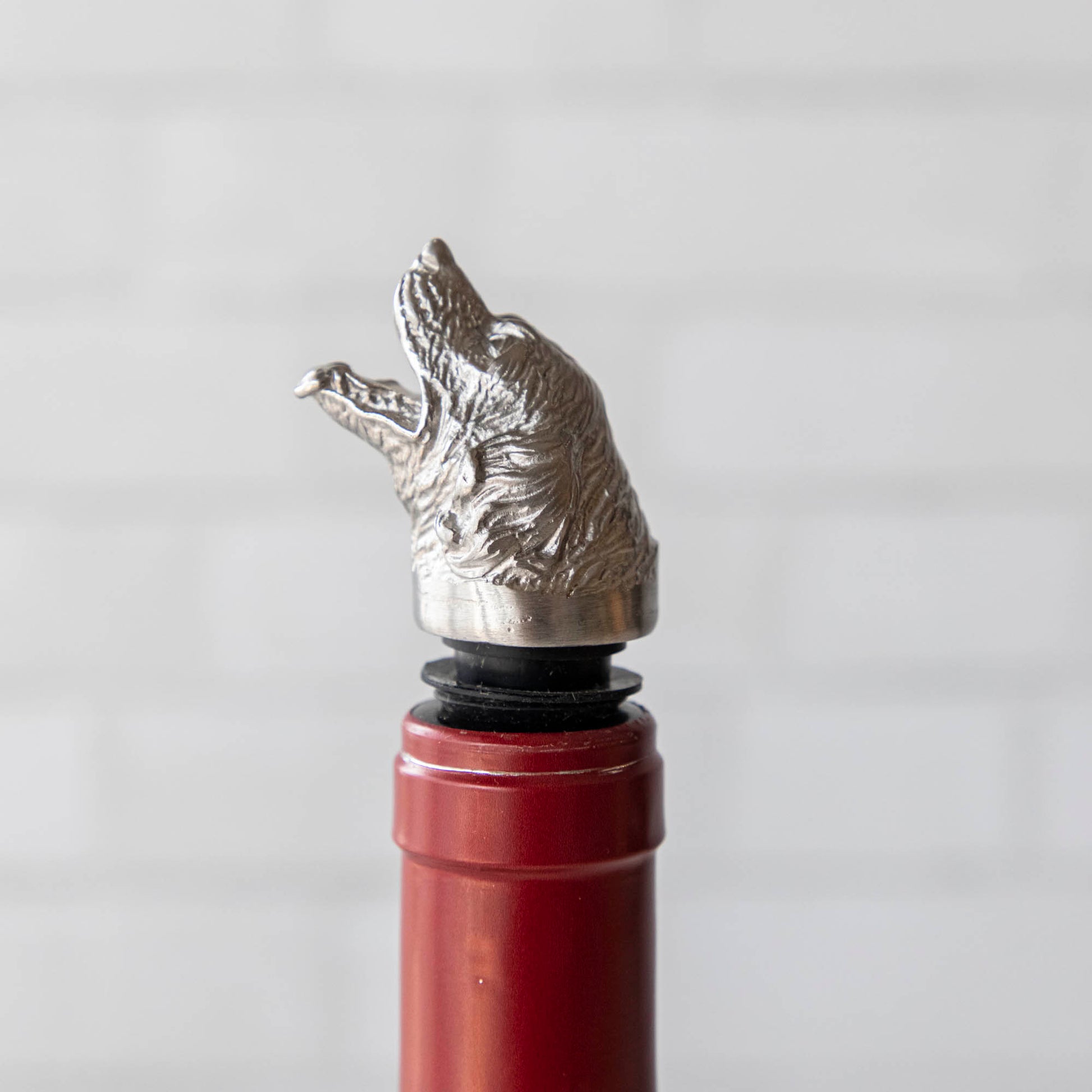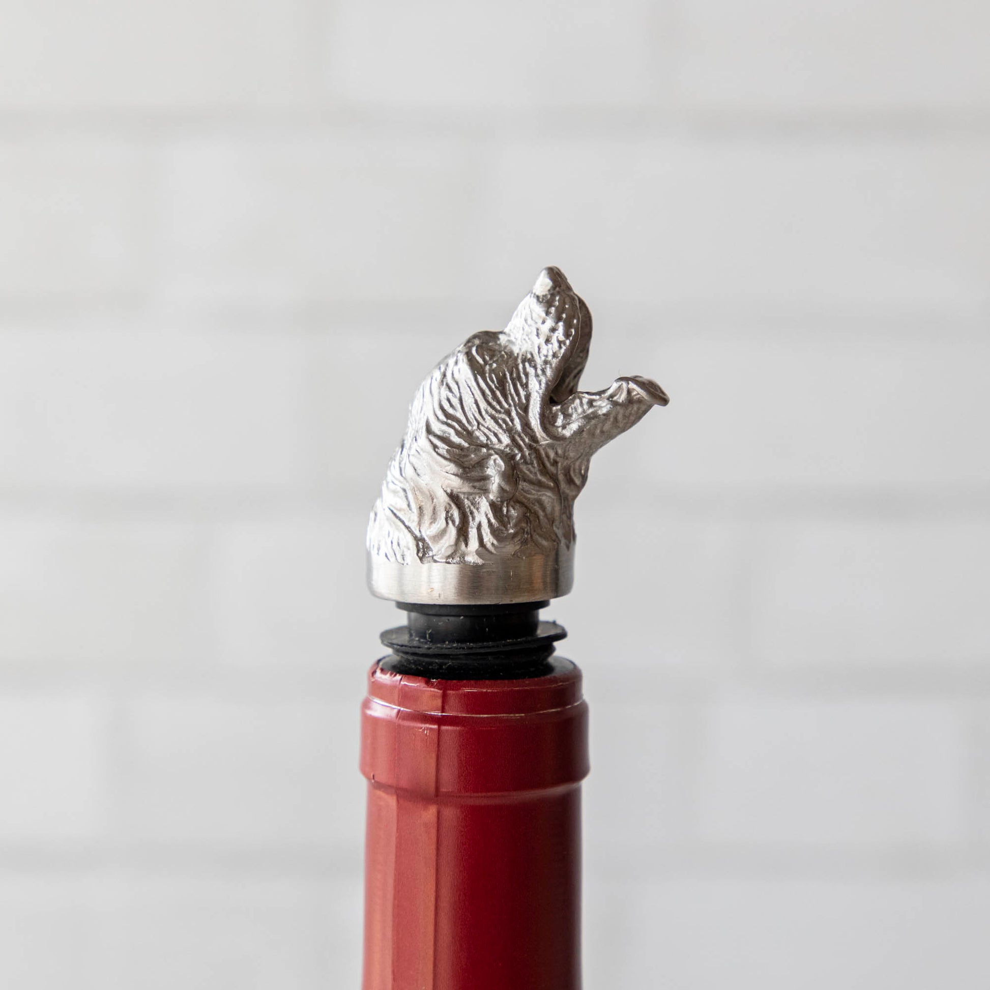 This stainless steel pourer-aerator is perfect for wine, spirits and even olive oil!   Liquid pours through the golden retriever's mouth and a silicone gasket ensures a secure fit. Dishwasher safe.