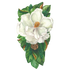 A die-cut illustration of a large white magnolia bloom surrounded by green and brown leaves.
