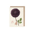 Purple Dahlia (Hello friend) Greeting Card featuring artwork of a woman holding a giant purple Dahlia and red text that says "Hello friend".