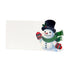 A blank, rectangular place card featuring an illustration of a waving, traditional snowman with a top hat, green scarf and gloves, on the right side.