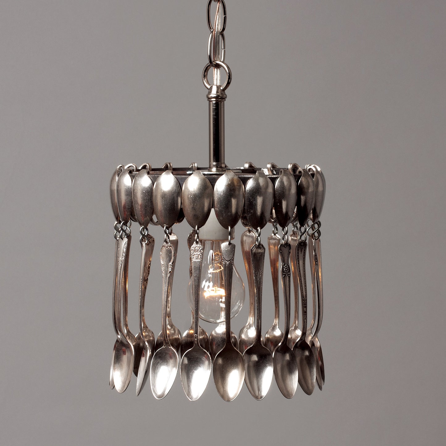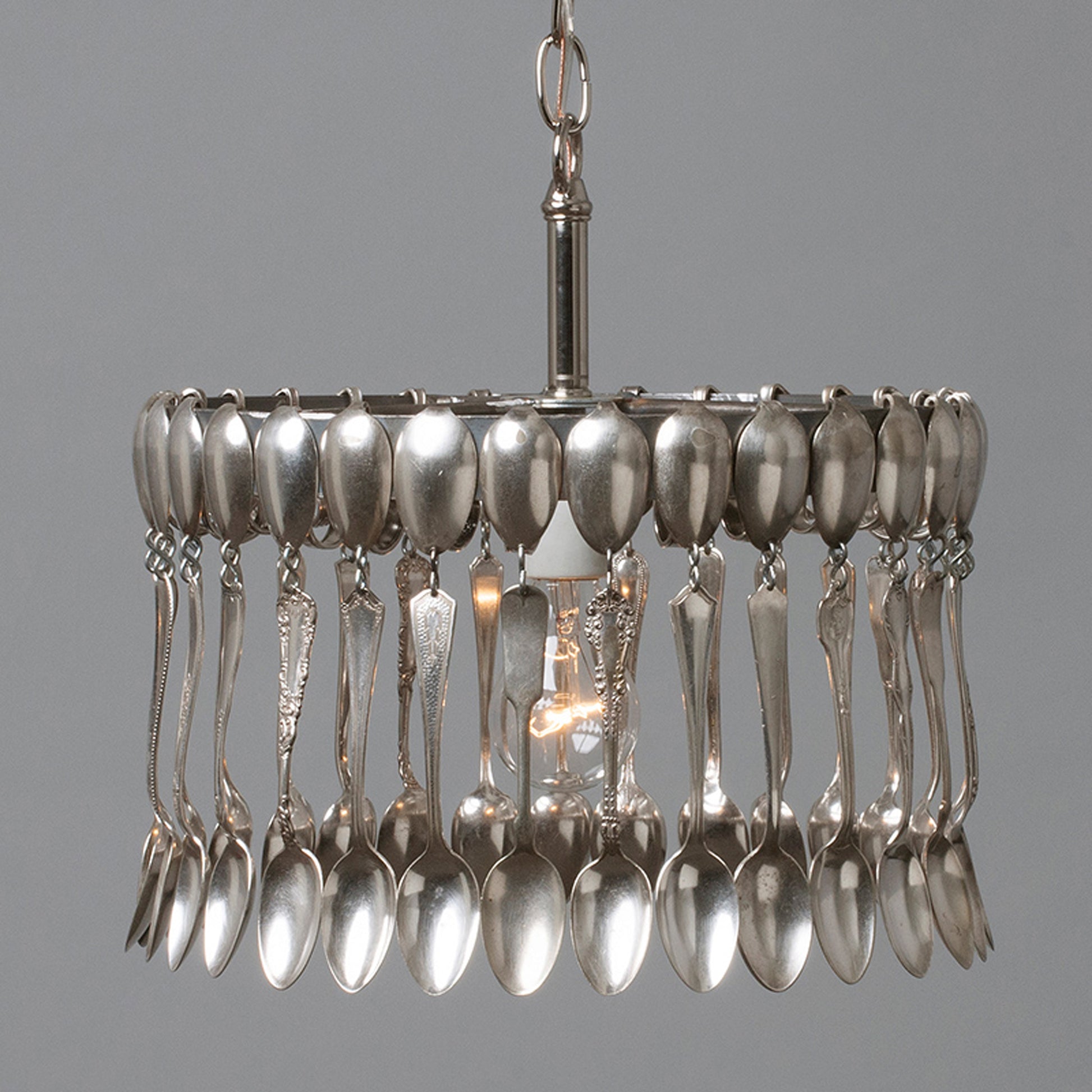 This beautiful hand-crafted light fixture uses high-quality vintage silver-plated spoons, adding a touch of whimsy to the kitchen or dining room.