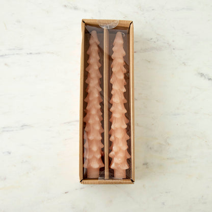 A set of two pink unscented tree-shaped taper candles, with one candle longer than the other, displayed on a surface with a decorative, antique-style gold candle holder.